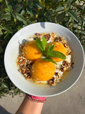 Knedle dyniowe z twarogiem waniliowym, kwaśna śmietana, prażone orzechy i migdały, syrop z agawy